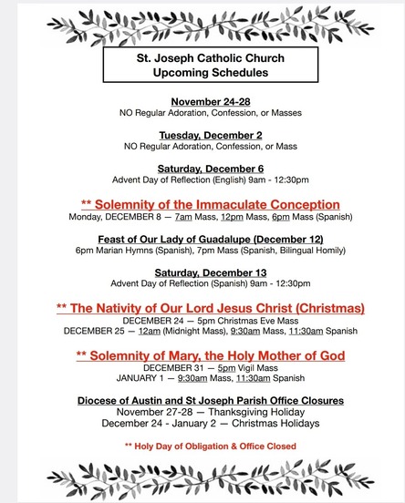 Join us on Saturday, December 6, from 9:00 am to 12:30 pm in the parish hall for an Advent Day of Reflection, led by Fr. Saenz. If you anticipate needing childcare, arrangements must be made by calling the office before December 1. Let us prepare our hearts for the coming of our Lord, Jesus. Snacks are welcome.